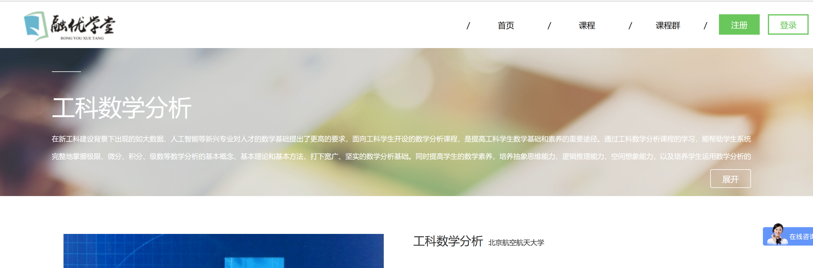 本课程共计233个章节,一方面涵盖了数学分析的经典内容,是对线下内容的精心凝练;另一方面,该课程既注重课程内容与实际应用的联系也注重课程内容与现代数学前沿问题的联系,在经典内容基础上添加了专题、案例、拓展、强化章节。本课程的发布,是对线下一流课程的重要补充,使员工在学习过程中能从整体和系统上掌握数学分析的核心知识、方法思想以及应用,是进一步提高工科员工数学基础和素养的重要途径。