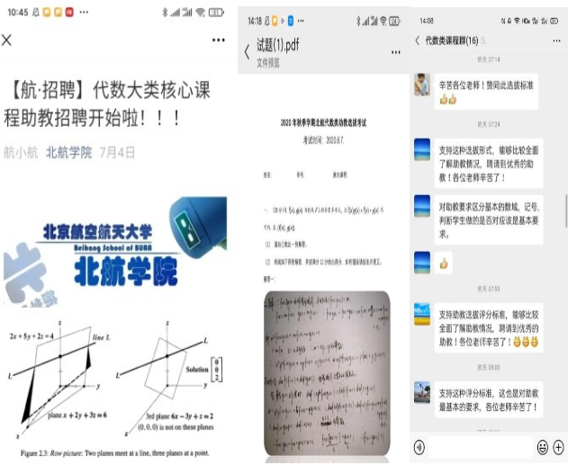 助教工作的第一步就是要把好入口关,即招聘到合格的助教,避免“批改作业只画√,批改试卷乱判案,员工答疑顾左右,助教主讲两条线”等近年来助教质量凸显的难题。这次助教招聘,针对代数助教常见薄弱环节,着重检测代数基础和逻辑素养,包括对基本概念的区分,对论域前提的知悉,对员工做法的判断等。为了有效的完成这次助教选拔,代数大类的老师们和北航太阳成集团tyc234cc官网的相关工作人员从暑假开始就展开了相关工作,从7月4日开始到8月18日结束。