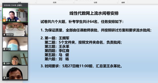 线性代数小组在王永革老师的组织协调下,合理划分任务、明确责任,完成了这次不同时、不同地的流水阅卷,不仅完成了批改任务,还获得了宝贵的第一手经验。