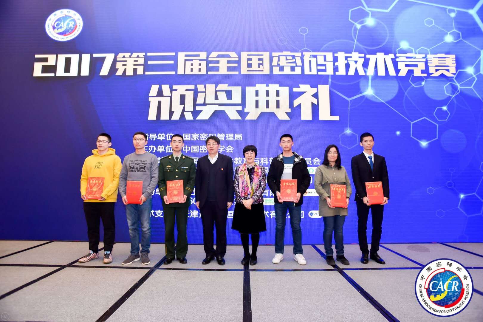 最后在颁奖典礼上,国家密码管理局徐汉良副局长、中国密码学会王小云副理事长为我们团队颁发证书并合影留念。