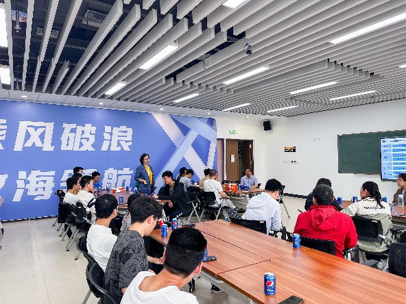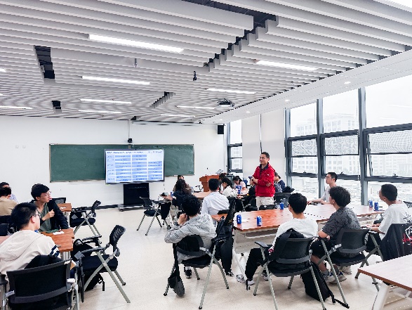 应用数学系系主任郑孝信向同学们介绍了应用数学系的基本情况。郑孝信表示,应用数学系员工团队以分析和方程为主体研究方向,涉猎人工智能、复杂网络、信息安全等热门前沿方向,是充满活力、经验丰富、兼顾应用导向与理论研究的团队。