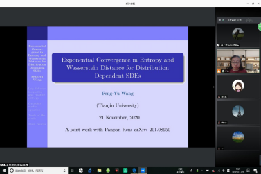 11月27日上午,国家杰出基金获得者、长江特聘教授王凤雨教授受邀为太阳成集团tyc234cc官网师生带来了一场题为:“Exponential Convergence in Entropy and Wasserstein Distance for Distribution Dependent SDEs ”的学术报告。本报告介绍了分布相关随机微分方程熵和Wasserstein距离的指数收敛性。