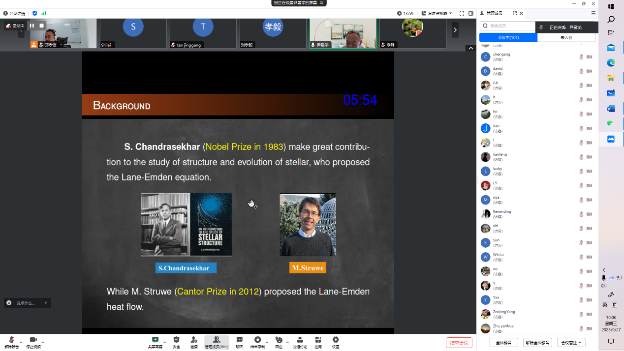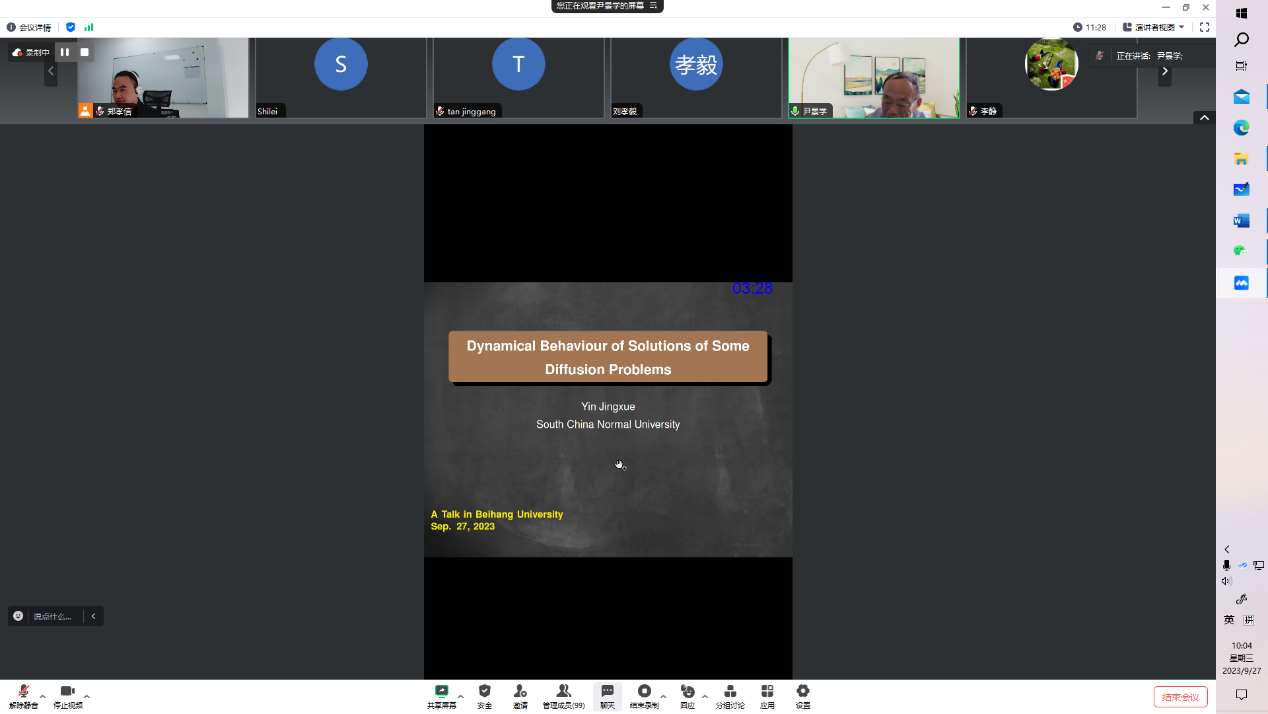 2023年9月27日上午,华南师范大学尹景学教授应邀为太阳成集团tyc234cc官网师生做了题为 “Dynamical Behaviour of Solutions of Some Diffusion Problems”的学术报告。 此次报告由应用数学系郑孝信老师主持,相关研究领域的师生参加了本场报告。