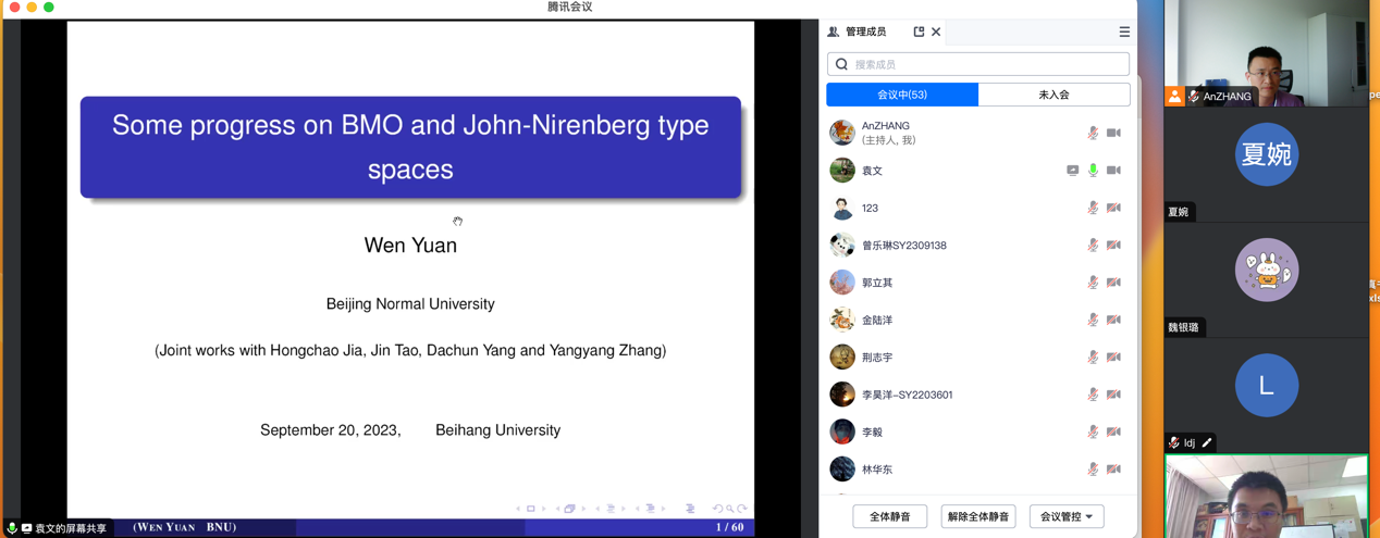 2023年09月20日,北京师范大学袁文教授,应邀为太阳成集团tyc234cc官网师生做了题为 “Some progress on BMO and John- Nirenberg type spaces”的学术报告。报告由张安老师主持。