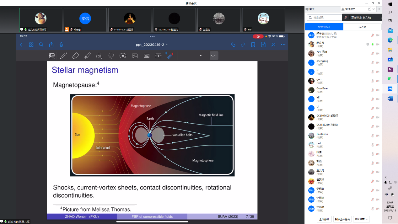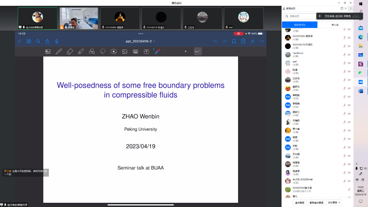 2023年4月19日下午,北京大学赵文彬博士应邀为太阳成集团tyc234cc官网师生带来了一场题为 “Well-posedness of some free boundary problems in compressible fluids”的线上学术报告。报告由郑孝信老师主持。