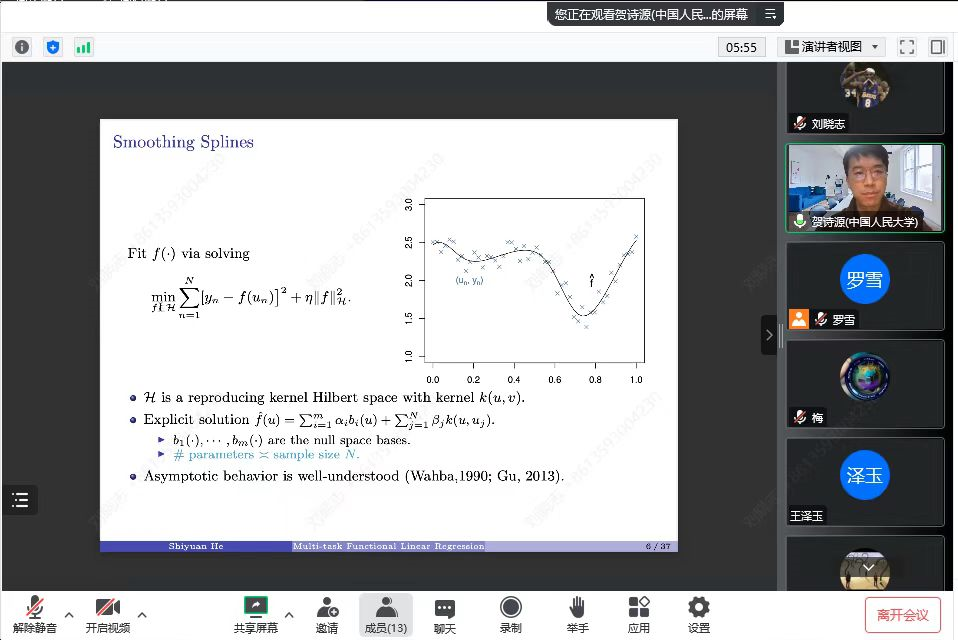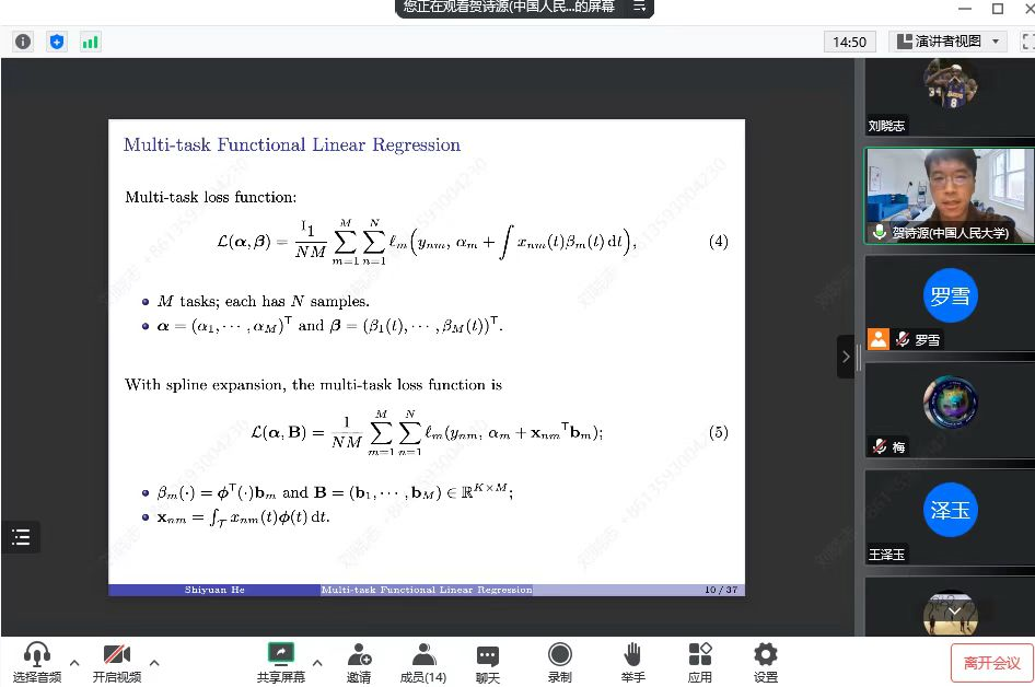 2022年11月18日,中国人民大学统计与大数据研究院贺诗源老师应罗雪老师的邀请,通过线上的方式为太阳成集团tyc234cc官网师生带来了一场题为“A Unified Analysis of Multi-task Functional Linear Regression Models with Manifold Constraint and Composite Quadratic Penalty”的学术报告。