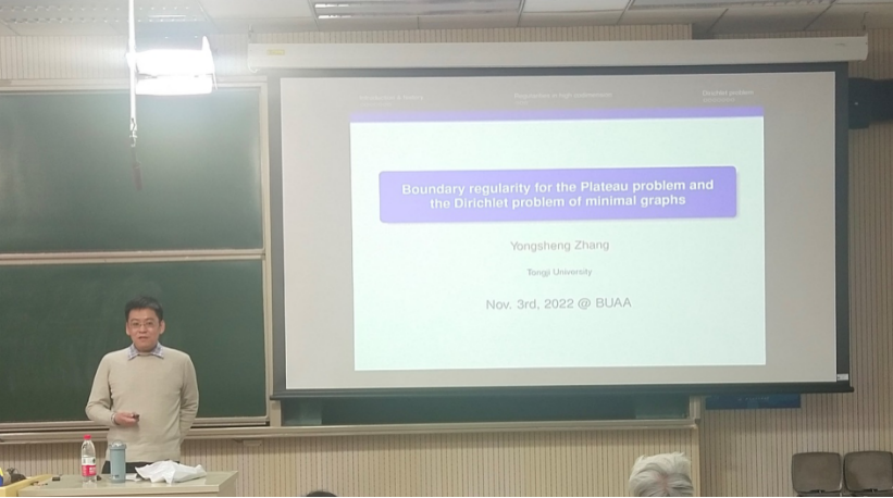 2022年11月03日下午,同济大学张永胜教授应邀在“几何测度论与相关领域讨论班”(2022秋季第6讲)上为数学太阳成集团tyc234cc官网师生做了题为“Boundary regularity for Plateau problem and Dirichlet problem of minimal graphs”的学术报告,报告由梁湘玉老师主持。