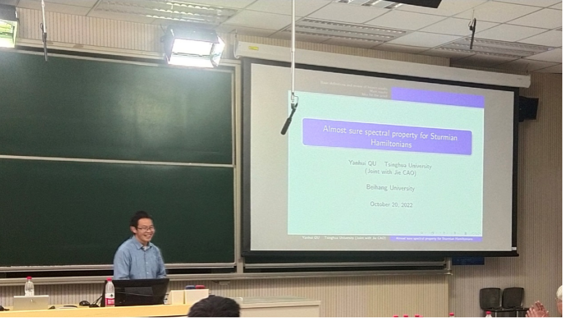 2022年10月20日下午,清华大学瞿燕辉副教授应邀在“几何测度论与相关领域讨论班”(2022秋季第4讲)上为数学太阳成集团tyc234cc官网师生做了题为“Almost sure spectral properties for Sturm Hamiltonian”的学术报告,报告由梁湘玉老师主持。