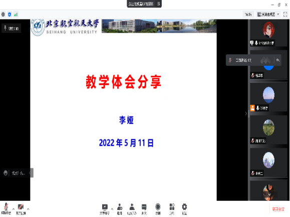 结合自身经历,李老师回顾了进入北航工作以来的工作心路历程。在李美生等有经验的老员工指导下,自己逐渐成长起来,每一次的进步都离不开教学团队的帮助。最后李老师建议青年员工,要勇敢地走出去,多参加一些教学比赛教学实践活动,积累经验,不断提升课程教学质量。
