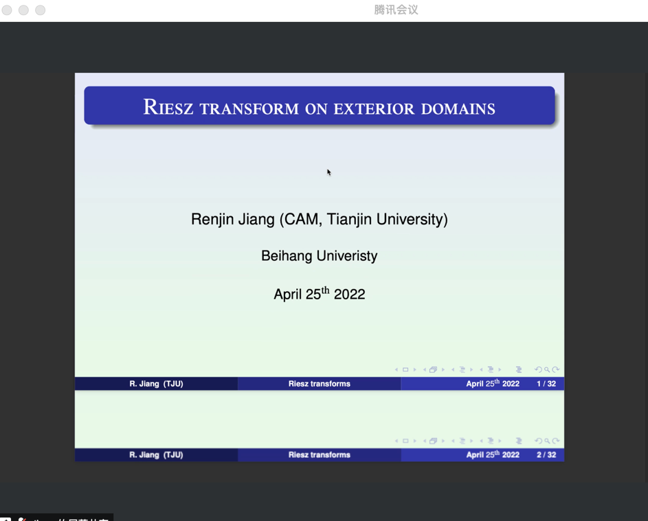 2022年04月25日,天津大学蒋仁进教授,应邀为太阳成集团tyc234cc官网师生做了题为 “Riesz transform on exterior domains”的学术报告,报告由张安老师主持。