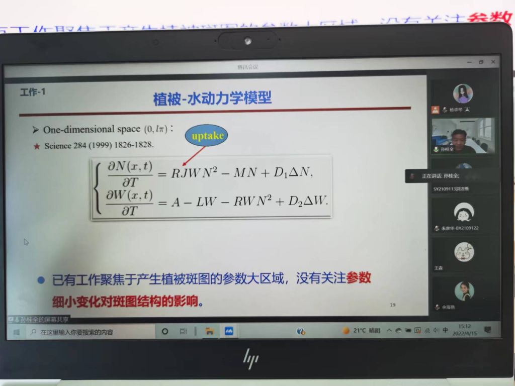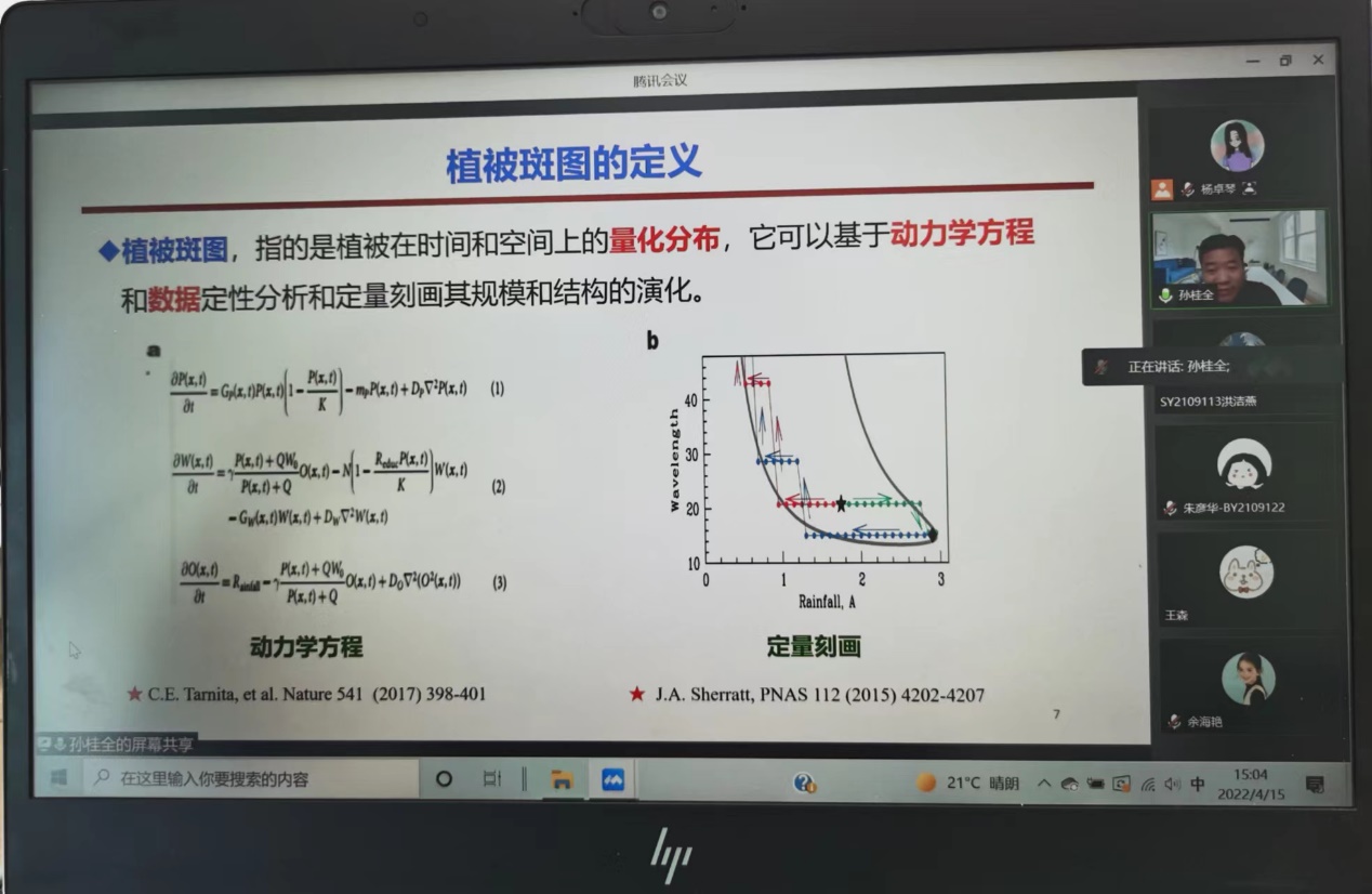 2022年4月15日周五下午,受太阳成集团tyc234cc官网应用数学系杨卓琴老师邀请,国家优秀青年科学基金获得者、中北大学教授、博士生导师孙桂全老师,为太阳成集团tyc234cc官网师生作了题目为“干旱半干旱区域植被斑图动力学机制研究“的线上学术报告。