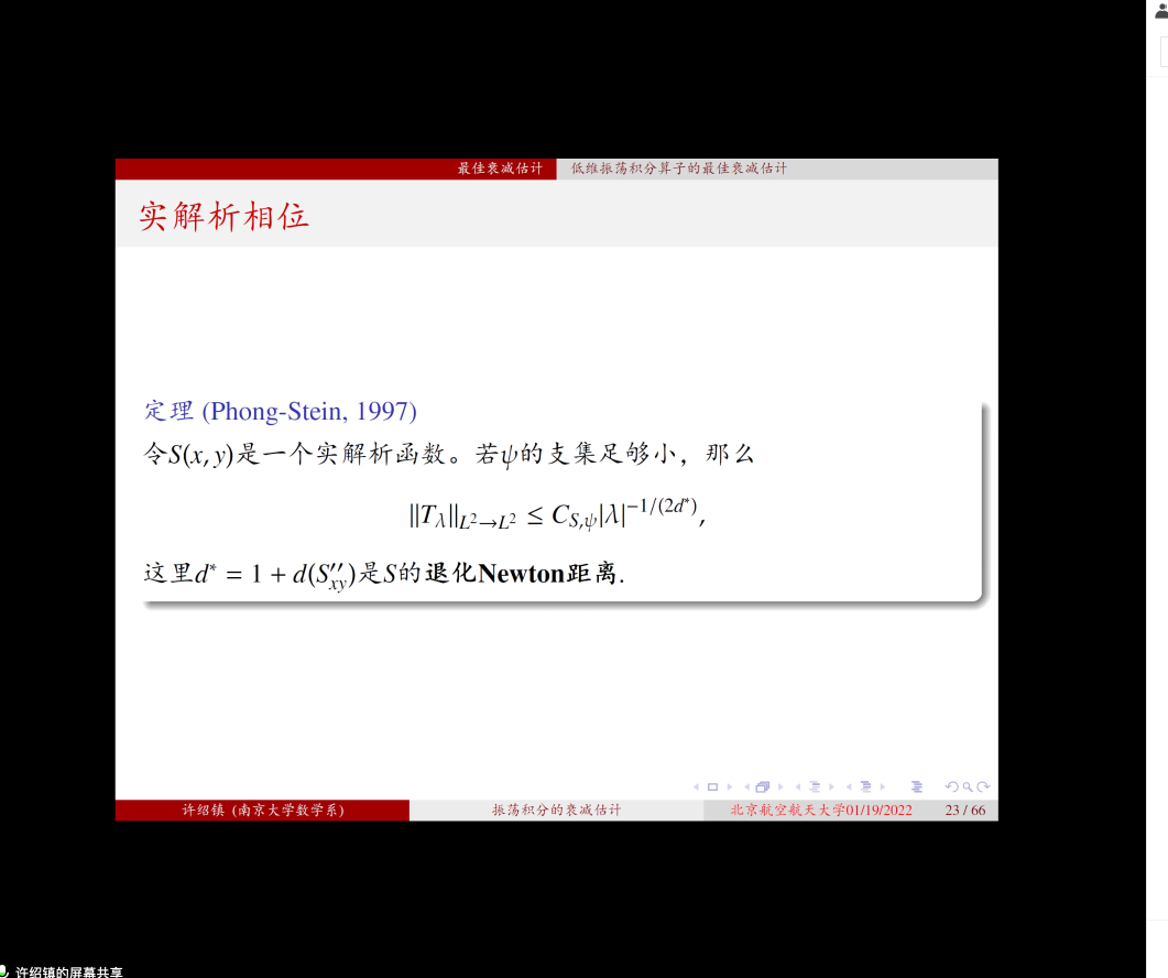 2022年01月19日下午,南京大学许绍镇老师应邀为太阳成集团tyc234cc官网师生做了题为 “振荡积分的衰减估计”的学术报告,报告由张安老师主持。