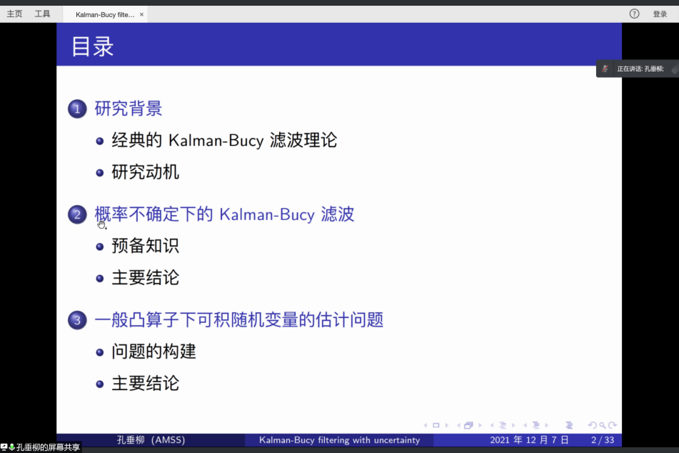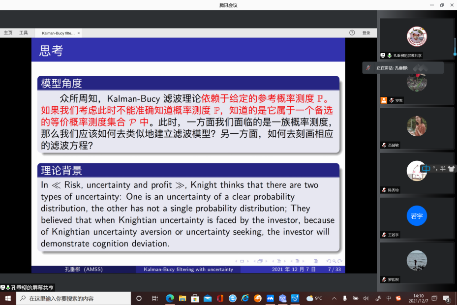 2021年12月7日,太阳成集团tyc234cc官网数学与系统科学研究院系统所博士后孔垂柳博士应罗雪老师的邀请,通过线上的方式为统计与运筹系师生做了一场主题为“Kalman-Bucy filtering and minimum mean square estimator under uncertainty”的学术报告。
