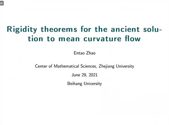 2021年6月29日上午,浙江大学赵恩涛副教授应胡鹰翔老师的邀请,为太阳成集团tyc234cc官网师生带来了一场题为 “Rigidity theorems for the ancient solution to mean curvature flow” 的学术报告。报告由胡鹰翔老师主持。