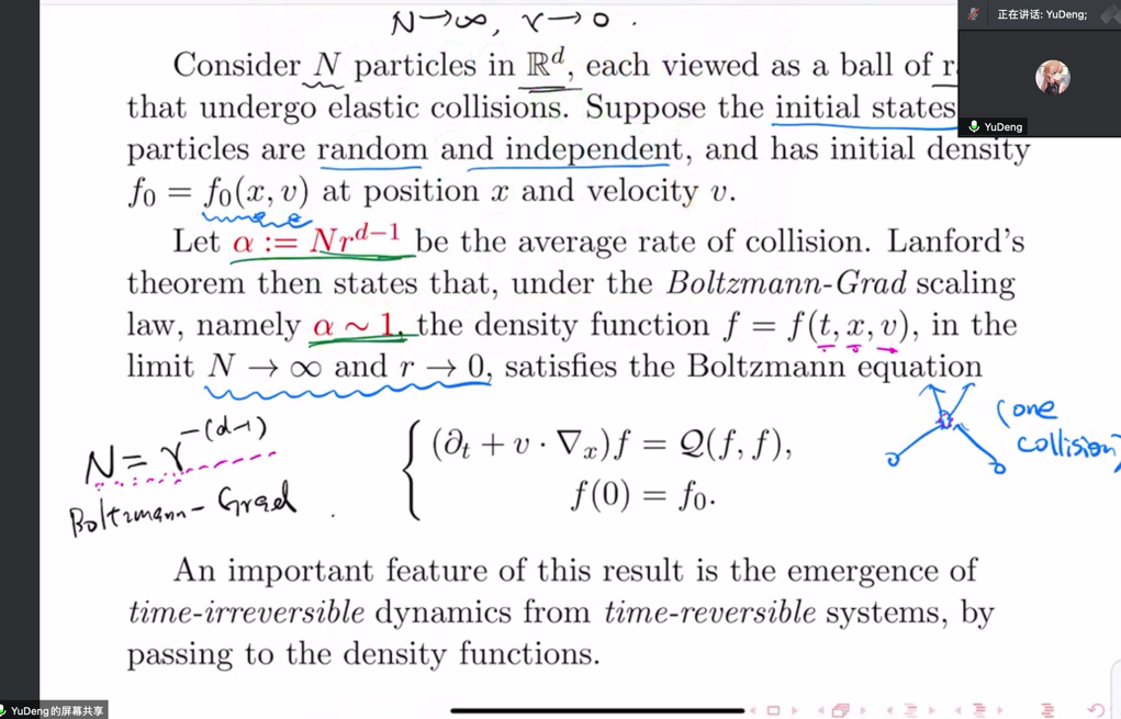 邓老师首先回顾了Hilbert第六问题和Lanford定理,进一步从粒子系统过度到一类波系统,介绍了湍流理论中的一个重要猜想—波系统的动力学猜想问题,以及已知的部分严格的数学结果。邓老师与合作者证明了在合适的伸缩法则下,三次NLS方程的热力学极限由相关的波动力学方程刻画,讨论了不同的伸缩尺度的选取问题,简要描述了证明的基本思路,以及这个猜想的解决对其他有趣的公开问题可能起到的推动作用,如Bourgain 关于环面上 NLS的解的长时间行为的猜想—Hs范数的增长问题。