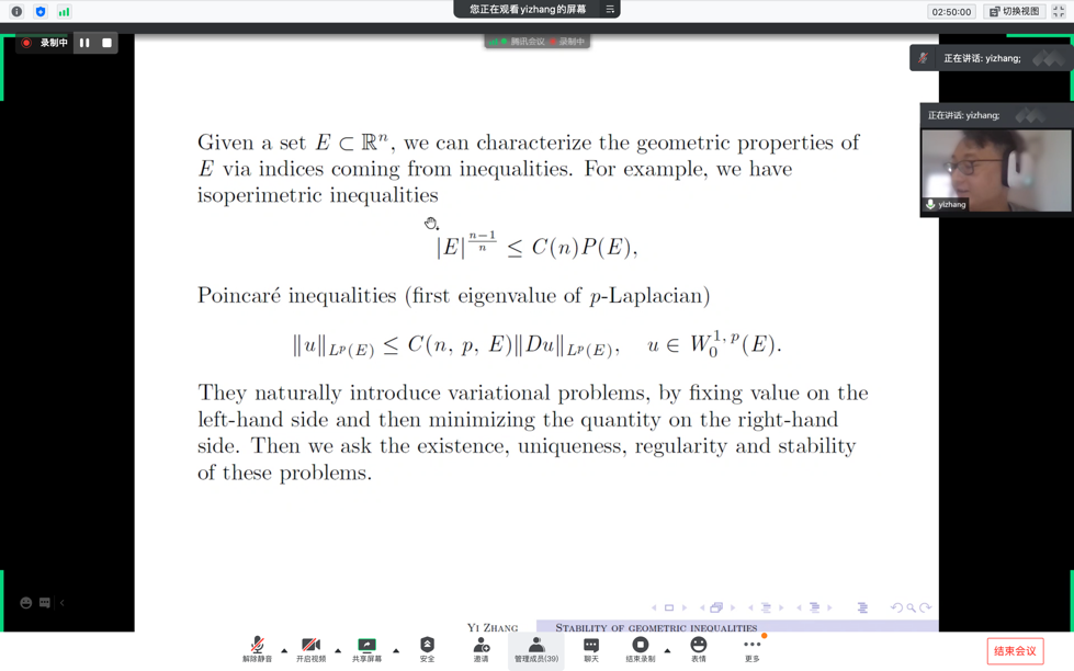 张翼老师首先从等周不等式的最佳常数、极值函数和稳定性优化开始详细介绍了几何不等式稳定性这一重要问题的历史和发展,分析了不同的证明方法。这类数学问题在分析、PDE、几何以及物理和工程中都有重要的意义。他还进一步介绍了该领域的一些最新结果,包括最近与合作者Fusco和Figalli 分别关于p-Laplace 第一特征值,p-Sobolev 和Wulff 不等式的稳定性估计。最后与参会老师讨论了一些开放问题。