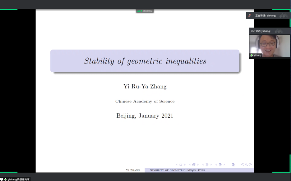 2021年1月13日下午,中科院数学所张翼副研究员,应邀为太阳成集团tyc234cc官网师生做了题为“Stability of geometric inequalities”的线上学术报告,报告由张安老师主持。