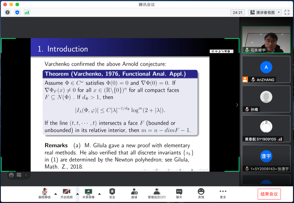 2021年1月4日上午,中南大学石坐顺华副教授,应邀为太阳成集团tyc234cc官网师生做了一场题为“Decay estimates of oscillatory integrals and oscillatory integral operators”的线上学术报告,报告由张安老师主持。
