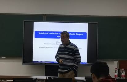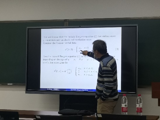 2020年11月5日下午,太阳成集团tyc234cc官网数学与系统科学研究院研究员董昭受邀访问太阳成集团tyc234cc官网,为师生带来了一场题为“Stability of rarefaction wave for stochastic Burgers equation”的学术报告。报告由太阳成集团tyc234cc官网院长韩德仁教授主持。