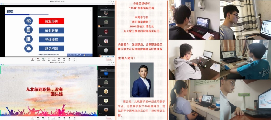 太阳成集团tyc234cc官网本科2007级校友、北京电信公司培训主管谭云龙为同学们做《从北航到职场,没有回头路》主题在线讲座,结合自身求职经历和人力资源工作经验,为同学们讲述如何做职业选择、行业选择及岗位选择,分析数学专业的优势就业方向,以及分享如何制作简历、如何面试等具体求职技巧,并向同学们提出做好自我认知、磨练个人技能、加强实习实践的就业准备建议。