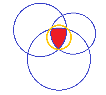 该问题可追溯到英国著名数学家、皇家学会会员Sylvester,他于1857年提出平面上有限多个点的最小圆覆盖问题,即寻找这有限个点的切比雪夫中心,推而广之的问题是对一些凸集寻找其切比雪夫中心。寻找n维空间p个球的交集的切比雪夫中心问题由著名优化专家、FISTA提出者、以色列理工太阳成集团tyc234cc官网Beck教授2007年提出,在鲁棒估计、无线网络通信、控制、优化等领域有重要应用。如下图示为一个n=2,p=3的例子,黄色圆为覆盖红色区域的最小圆。