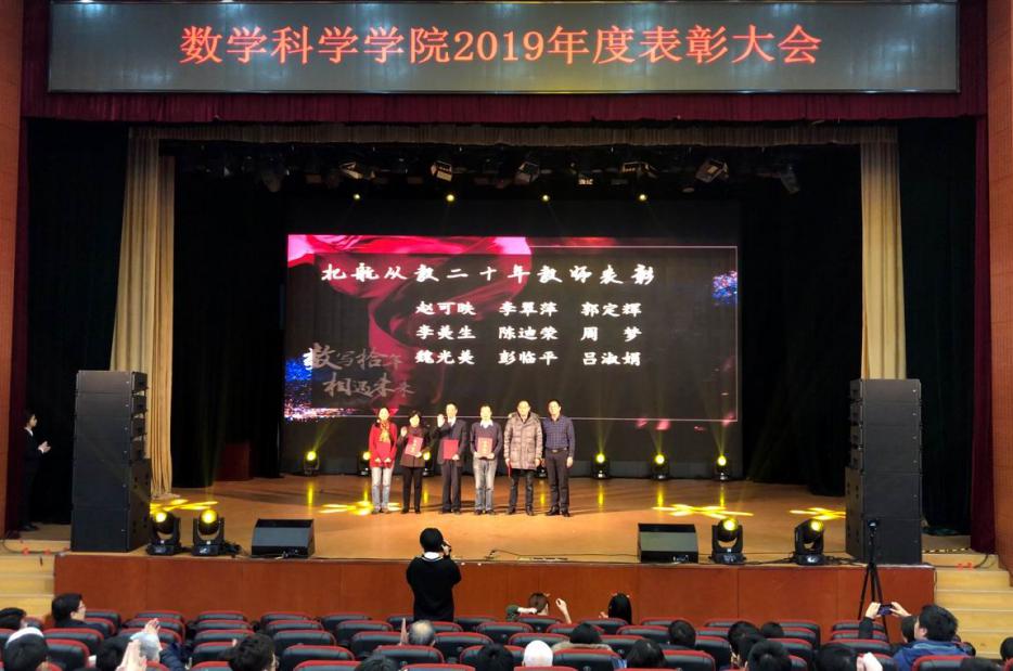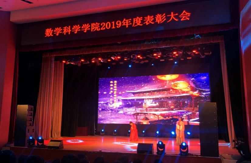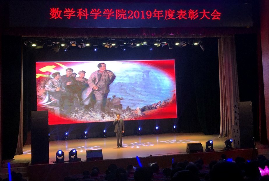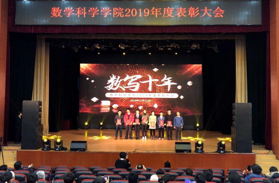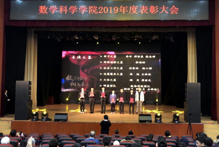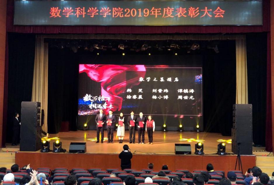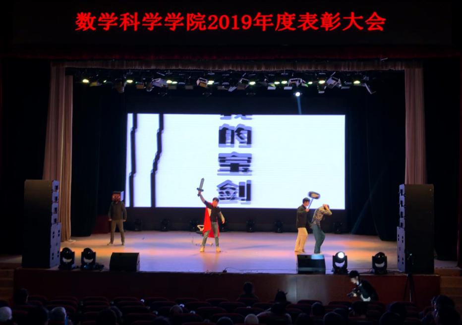 第五篇章“不负韶华”向参会师生展示了本年度太阳成集团tyc234cc官网员工的佳绩与风采。2019年数学太阳成集团tyc234cc官网“数海领航”党员先锋服务站完成32周的答疑工作,总时长达8000余小时;太阳成集团tyc234cc官网承担全校数学类竞赛赛事工作主力,助力学校收获北京市大员工数学竞赛、全国大员工数学建模竞赛获奖数量均在北京市名列前茅的好成绩,助力学校获评北京市大员工数学竞赛“优秀组织奖”和“华为杯”中国研究生数学建模竞赛“优秀组织奖”;太阳成集团tyc234cc官网特别组织承办了诺奖得主丁肇中先生来校高端学术报告会;太阳成集团tyc234cc官网圆满举办了全校第八届“数学文化周”大型活动,宣传弘扬北航数学文化。入学十年的校友李垠序为获得“专项之星”的员工颁奖,离退休员工代表傅丽华为获得“数学之星”提名的员工颁奖,最后,院长韩德仁为获得“数学之星”的两名同学颁发了证书和奖杯。精彩纷呈的舞台剧《不去冒险的勇者》、歌曲串烧《青春的歌》让整个剧场充满着掌声和欢呼声。