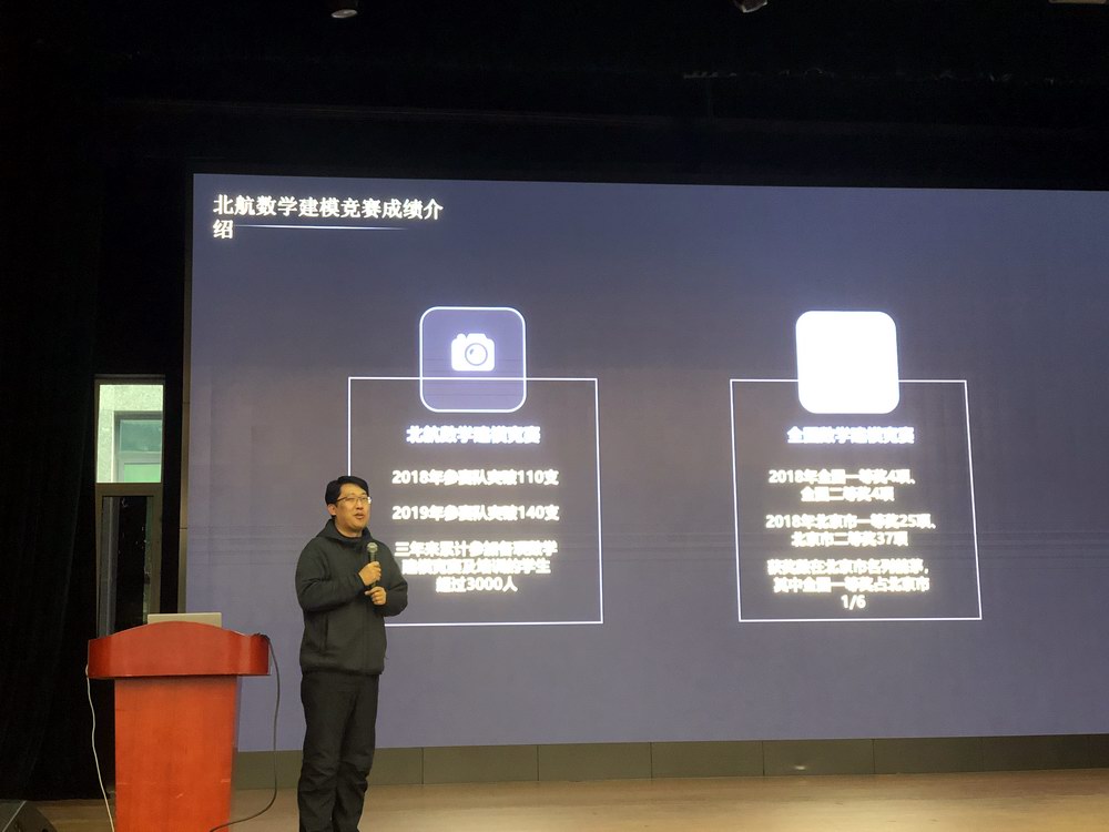 闭幕式第二项,北航数学建模指导员工郭炳晖为现场师生介绍了近年来北航在全国和北京市数学建模赛事中取得的优异成绩以及今年北航校级数学建模竞赛的组织和开展情况。