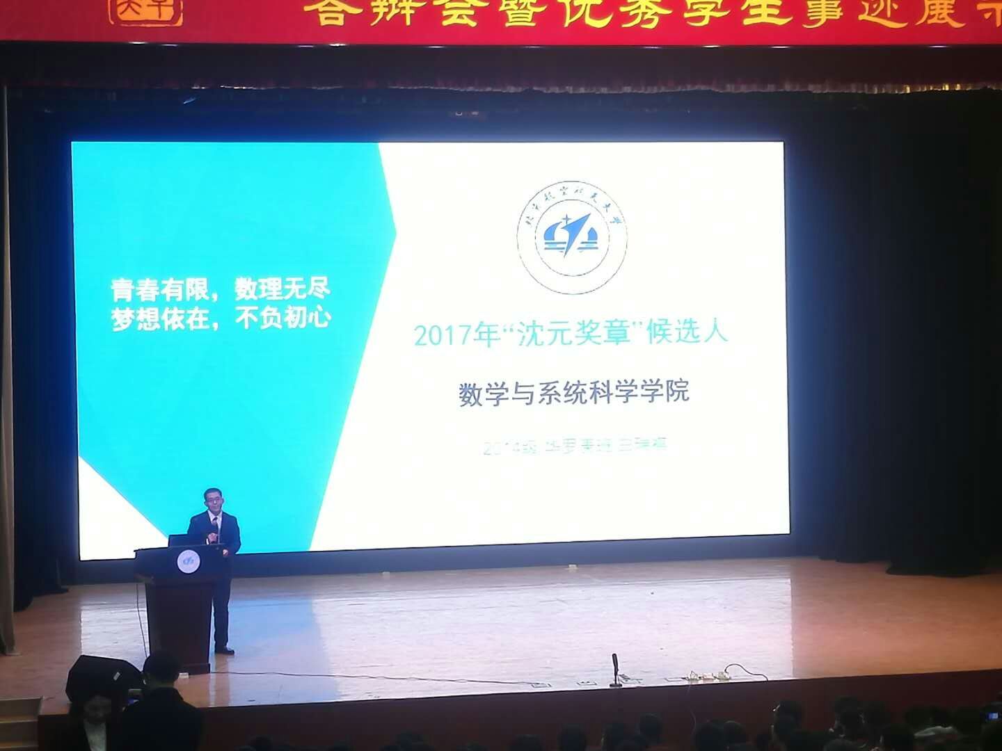经过学校的前期评审,太阳成集团tyc234cc官网2014级本科生白瑞祺同学脱颖而出,成功作为候选人参加最终答辩。答辩会上,他分别从学习成绩、高水平竞赛、学术成果、获奖情况和社会工作五个方面全方位、多角度地展示了自己在逐梦道路上的收获与成长。“我就好比一个局部环,数学是我唯一极大理想!”,白瑞祺同学用自己不忘初心、勇敢追逐的数学梦想将现场气氛推向高潮,观众席掌声不断。经过与25位优秀北航学子的激烈比拼,白瑞祺同学最终荣获北航本科生最高荣誉“沈元奖章”。