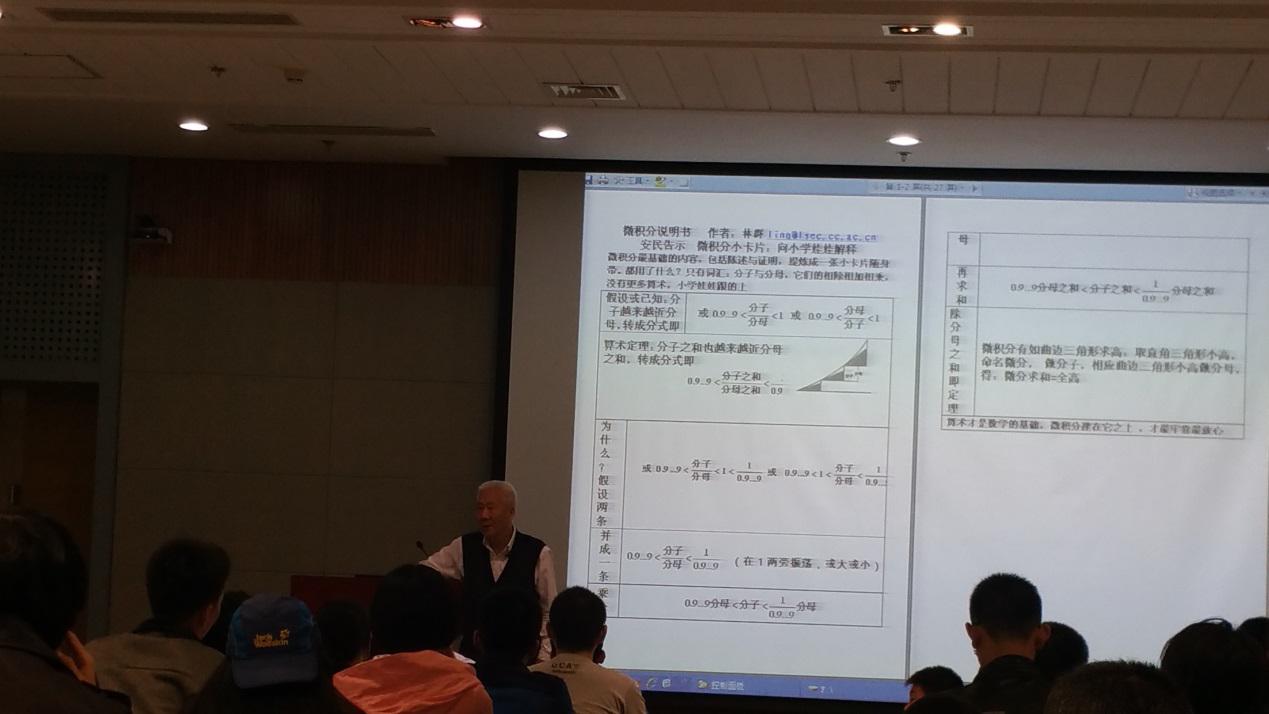 最后,林群院士给我们带来了他对当今数学的看法与见解。林老表示,当今数学应当走向通俗化,他说数学应当像列夫托尔斯泰的小说一样,让所有人都能接受,让所有人都能从中读到东西。林老通过向我们展示“微积分卡片”,向在场学子们传达了学数学要抓根本的道理。