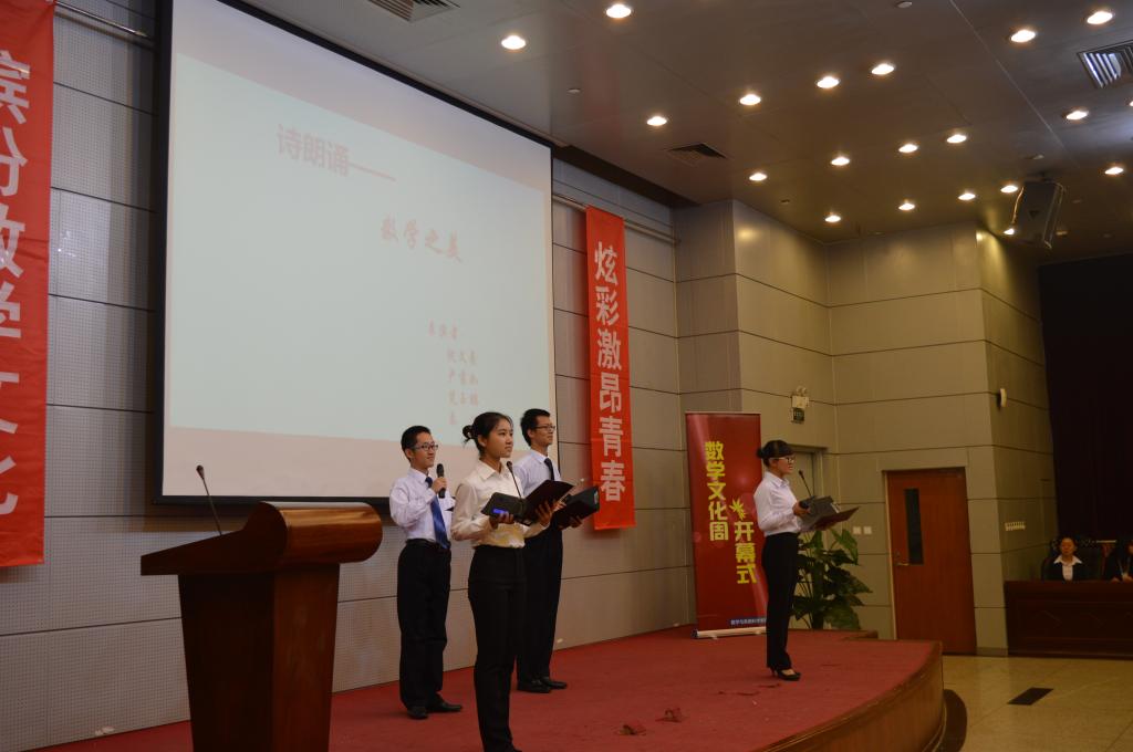 开幕式在精心制作的宣传视频中拉开帷幕。首先,数学太阳成集团tyc234cc官网员工会主席方泽华同学介绍了北航数学文化周的发展历史和活动安排,盛情邀请校内外的同学们参与文化周的活动。接下来,数学太阳成集团tyc234cc官网2015级的同学们带来了诗朗诵《数学之美》和歌曲串烧,激昂的朗诵和轻松的歌曲展现了数学太阳成集团tyc234cc官网员工们的蓬勃朝气和对数学的热爱。