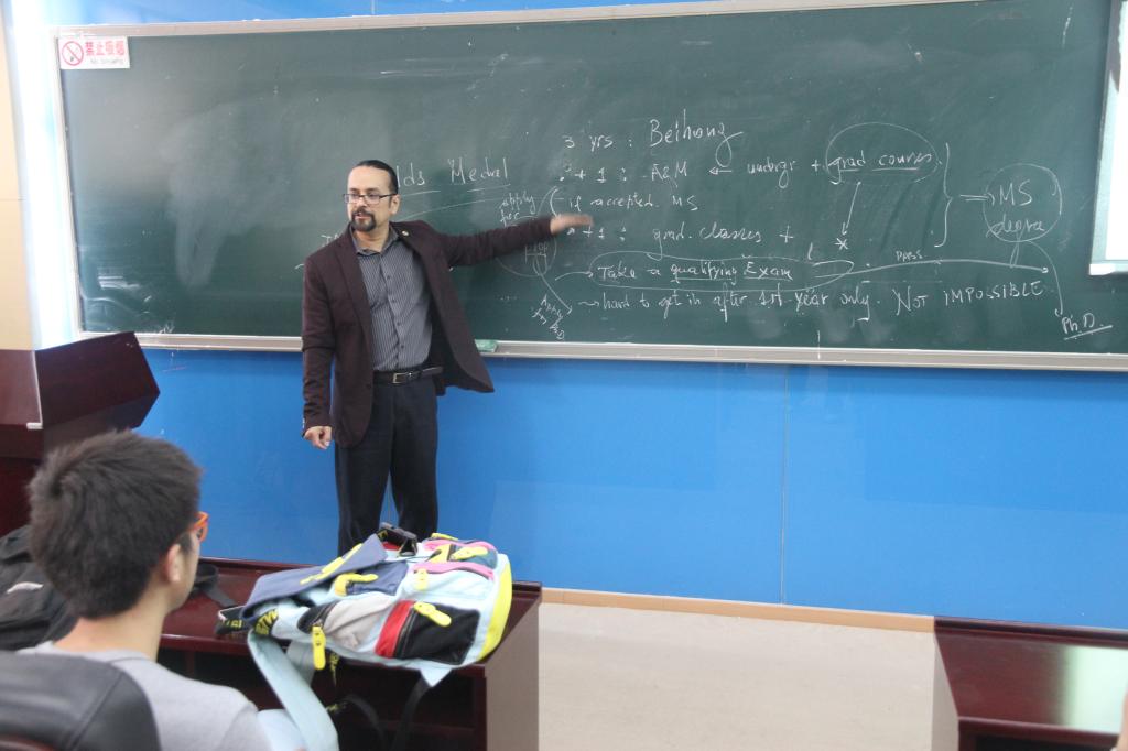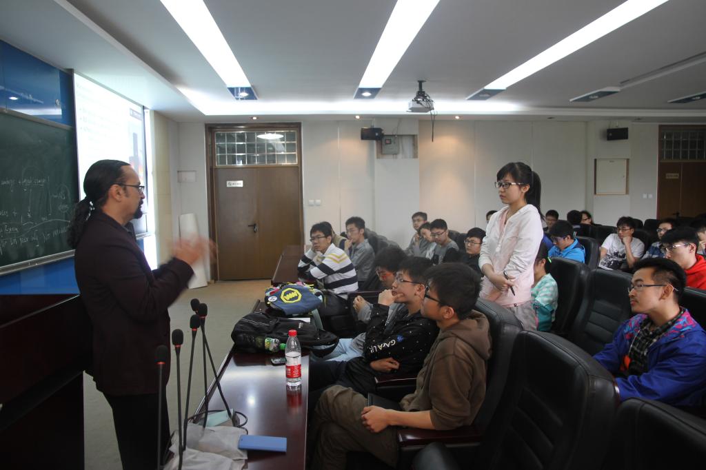 Lima-Filho教授首先向同学们展示了美国德克萨斯A&M大学理太阳成集团tyc234cc官网(TAMU Science Department)近年来的办学及发展概况,并详细介绍了理太阳成集团tyc234cc官网各个数学专业方向的人才培养计划包括各类专业所修的课程清单及未来就业方向。接下来他为大家介绍了“BUAA- TAMU数学专业本科生快车道”这一国际交换项目的具体情况,即在北航数学太阳成集团tyc234cc官网完成前三年的学业后申请去TAMU继续读一年的graduate和undergraduate混合的课程,然后由员工学习情况决定在接下来的一年内读完Master Degree或是直接去攻读PHD。接下来的互动交流环节中,同学们就当前关心的申请问题以及未来规划向Lima-Filho教授踊跃提问,教授清晰亲切的一一作答也解答了同学们心中存在的疑虑。此次座谈会进一步推进了太阳成集团tyc234cc官网与美国德克萨斯A&M大学的沟通,也为2015年华罗庚班的国际交流计划的实施拉开序幕。