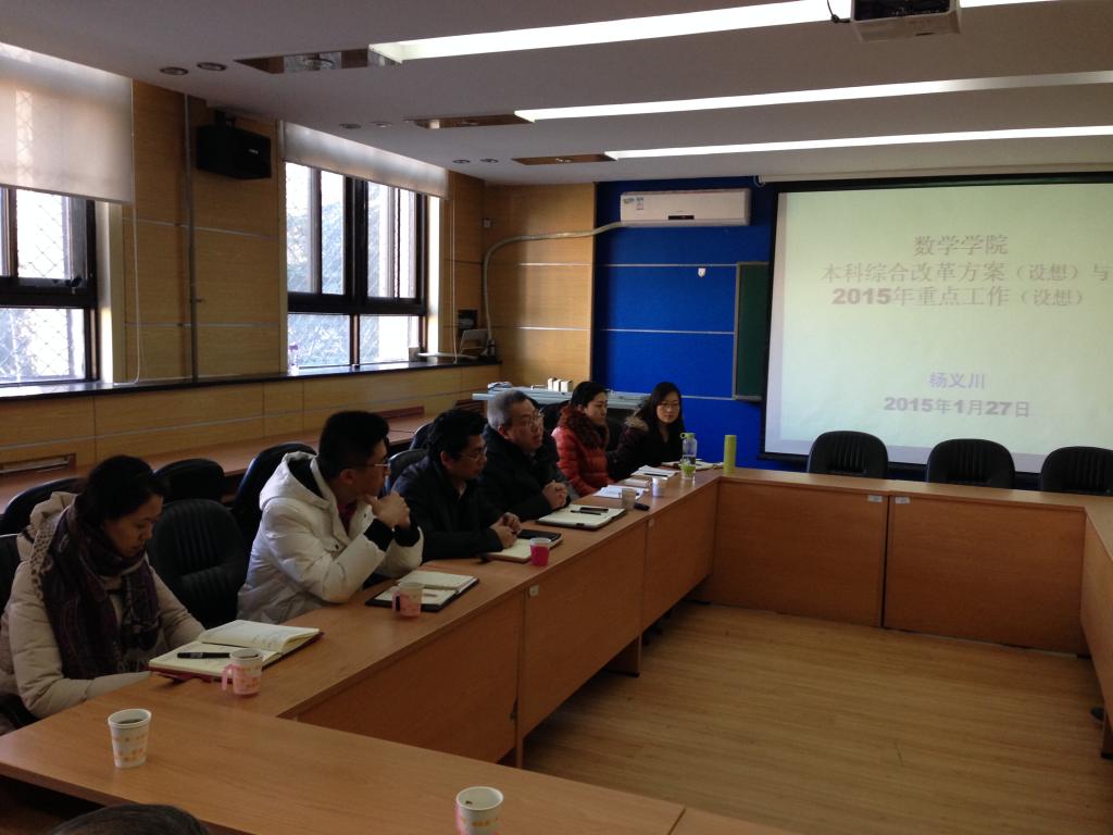 首先,李红捷书记对教务处冯处长一行六位领导的到来表示欢迎。随后教务处冯文全处长介绍了此次调研走访的目的:“到基层调研,既想听到好的声音,从太阳成集团tyc234cc官网的快速发展中受到鼓舞,同时也希望发现并尽可能解决好一些在我校教育教学改革过程中出现的问题。“ 郑志勇院长代表太阳成集团tyc234cc官网对学校和教务处长期以来对太阳成集团tyc234cc官网的关心和支持表示感谢,并就优化和整合学校教学资源配置、深化落实变教为学、以学为主的教学思维和重视理科实验班培养等问题做了重点说明。杨义川副院长向与会领导、老师汇报了太阳成集团tyc234cc官网本科教学综合改革初步方案设想和2015年太阳成集团tyc234cc官网本科教学拟重点问题。