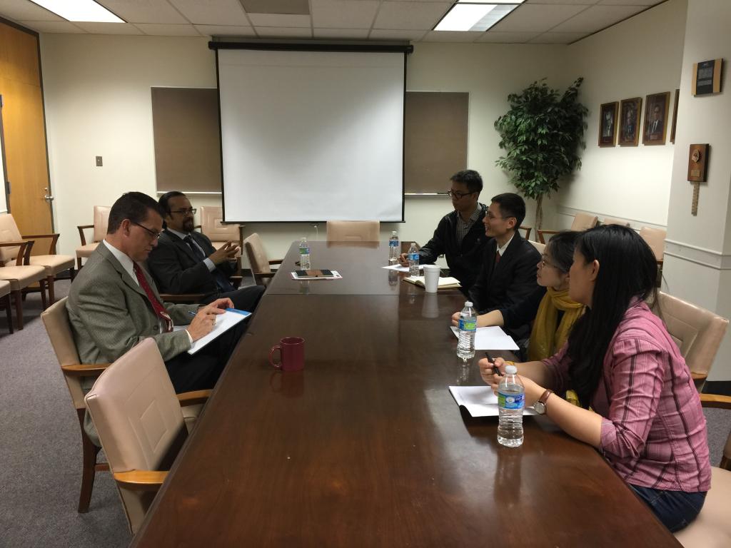 访问期间,代表团分别与TAMU理太阳成集团tyc234cc官网负责国际交流合作的副院长Lima Philo教授,TAMU中国学者员工联合会主席、数学系周建新教授,TAMU理太阳成集团tyc234cc官网负责本科生项目的副院长Timothy P. Scott教授,统计系系主任Valen E.Johnson教授,统计系研究生招生委员会主席黄建华教授,TAMU校长办公室常务主任克兰迪副教授等进行会面,交流洽谈双方在提升和延续数学快车道项目、统计快车道项目、研究生阶段资助计划、员工培养、员工之间的学术交流等多方面可行性的合作。双方在数学快车道3+1+1的推进、建设统计学科和课程、TAMU员工访华、员工短期授课交流等方面达成共识。