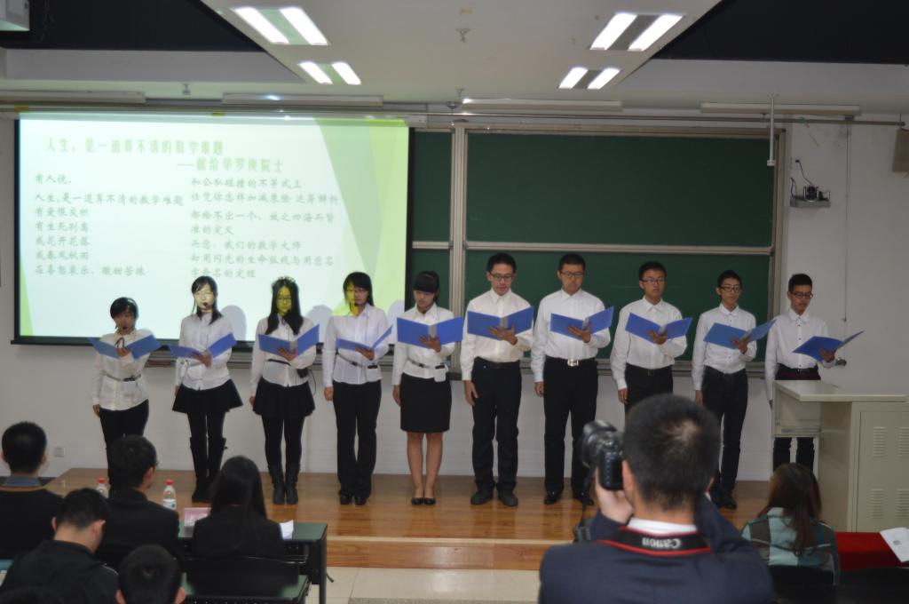 首先,2014级数学太阳成集团tyc234cc官网的同学们带来了以缅怀华罗庚先生为主题的精彩诗朗诵——《人生是一道算不清的数学题》。同学们激情饱满的朗诵获得了阵阵掌声,大家都为一代数学大师华罗庚的光辉事迹而感动。数学太阳成集团tyc234cc官网员工会主席阎晓萌同学代表太阳成集团tyc234cc官网全体同学发言,向大家发布了数学文化周系列活动如数学建模大赛、数学知识擂台赛、趣味数学越野等活动的安排。接下来,数学文化周的视频吸引了现场所有人的眼球,围绕着“数学是什么”这一问题的校园街头采访,同学们用文艺或幽默回答诠释了数学的美丽与魅力。随后,在场嘉宾一起为数学文化周的开幕剪彩。