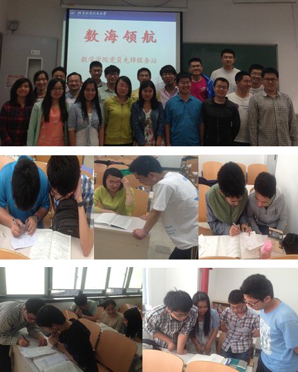 活动内容: 全校同学都可以到教室来,没有专业、年级限制,目前开通以下能: (1)数分、线代、概率等专业课程答疑,解题技巧,题型总结 (2)数学竞赛,建模比赛经验分享,问题讨论。 (3)论文撰写技巧,侧重于与数学相关领域。 (4)想与数学专业同学合作项目,登记相关信息后帮忙联系。 加入我们:(1)现场参与:2014年5月7日——6月22日,每周三下午3:20——5:20,沙河校区J5-204教室。现场会有至少7人数学太阳成集团tyc234cc官网员工党员,包括本科生、硕士研究生、博士研究生,其中研究生至少2人,且必有专业大神,成员实力有保障。(2)线上参与:时间原因不能参加现场答疑的同学,可在ihome或人人上添加【数海领航】为好友,有问题直接发图@我们,或者留言。每周服务站会选派7人线上值班,保证解答速度。(3)质量保障:服务站答疑质量和累计时间将作为太阳成集团tyc234cc官网考察入党积极分子和预备党员的重要渠道,有正规的组织和监管,如有发现态度不端的服务站成员,可以随时通过ihome【数海领航】公共主页、人人主页或者向现场负责人投诉。 联系我们:站长信箱:shuhailinghang@163.com ihome主页:数海领航 人人主页:数海领航欢迎广大师生多提宝贵意见和建议,诚邀您的加入!
