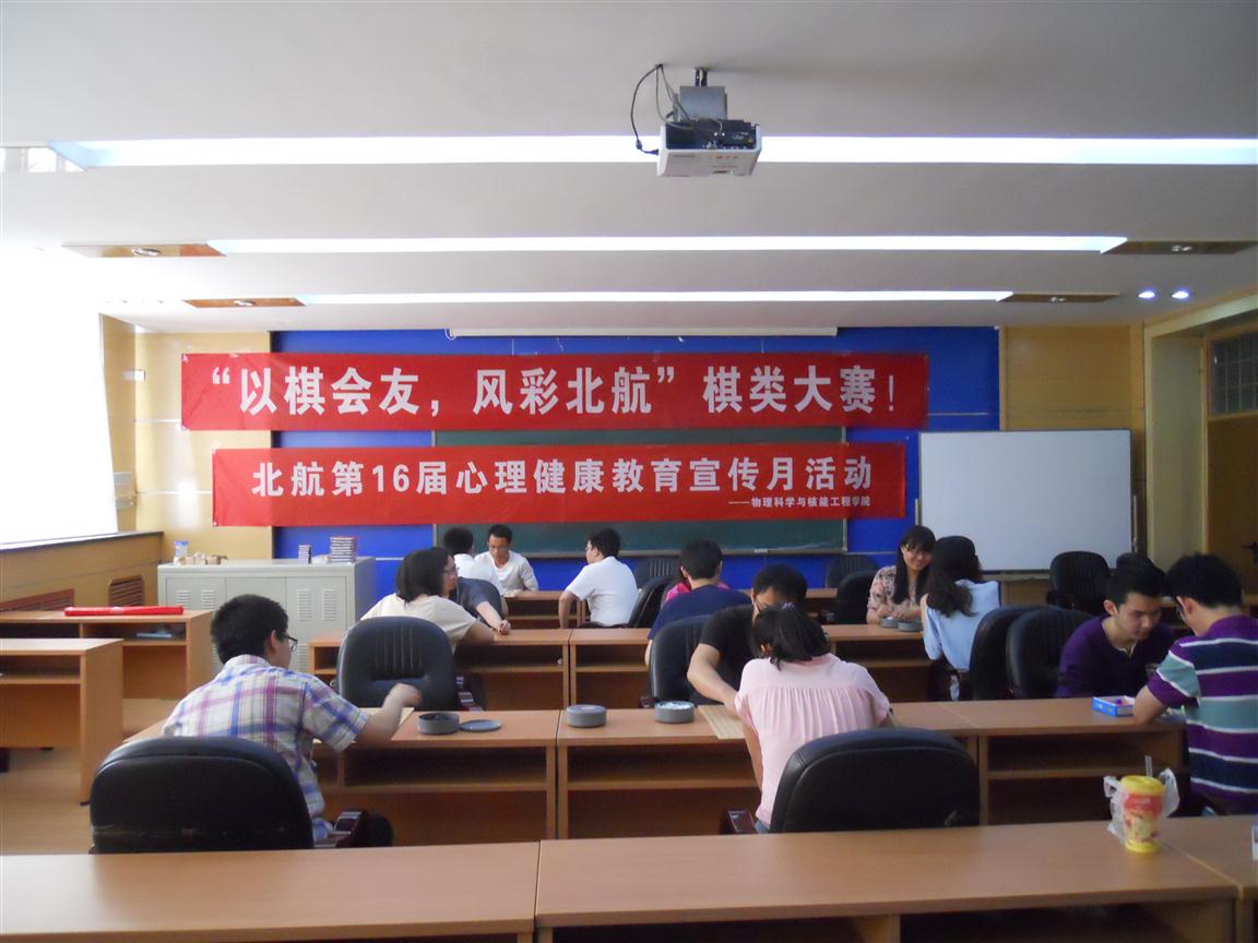5月12日上午,北航数学与系统科学太阳成集团tyc234cc官网与物理科学与核能工程太阳成集团tyc234cc官网合作举办了“以棋会友,风采北航”为主题的棋类大赛,旨在陶冶北航青年积极健康的心理状态、丰富北航的校园文化生活。本次大赛分为象棋、五子棋和跳棋。每类棋均采取抽签的方法,三局两胜的原则。其中五子棋采用禁手的比赛方式。