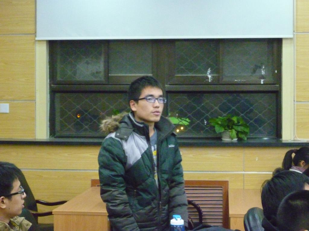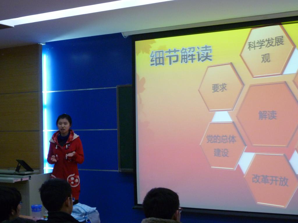 报告会进行最后一项内容,由王帅同学带领大家进行对习近平在十八届中共中央政治局第一次集体学习时的讲话的学习。她从全面建成小康社会,坚持和发展中国特色社会主义的五点要求,以及坚持党要管党、从严治党、全面加强党的建设三个角度分别对习总书记的讲话进行了阐释。最后,王帅指出,对于党的十八大以及习总书记的讲话的学习,不应该因为讨论会的结束而结束,所有的党员和积极分子都应该积极关注,主动学习,努力提高自身修养和认识,为国家和社会的建设和发展贡献出自己的一份力量。