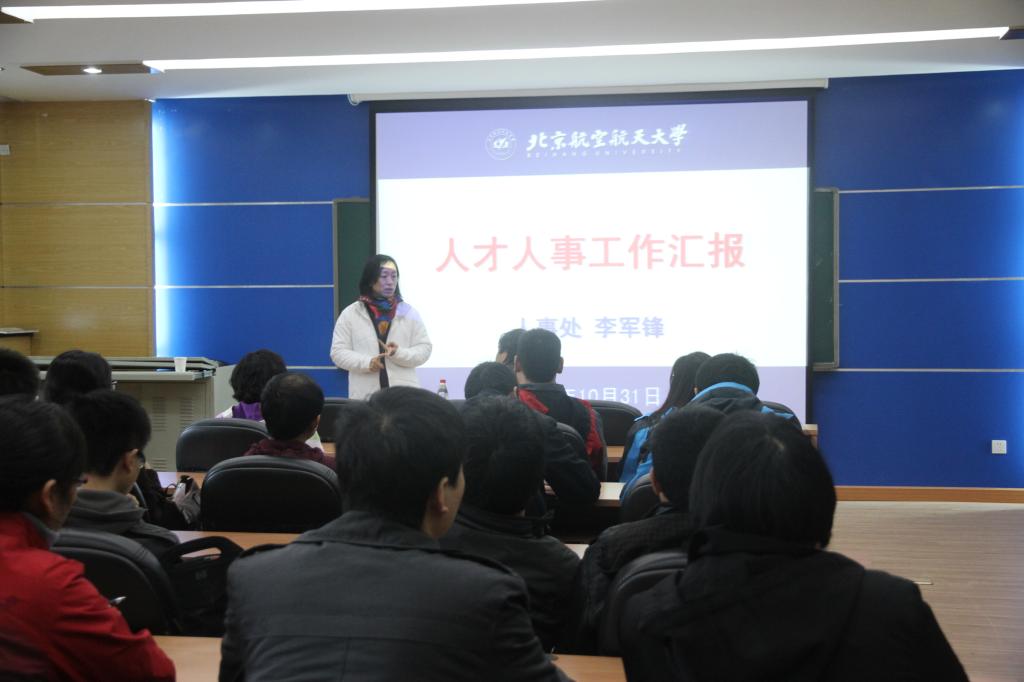 李军锋处长讲到,围绕学校建设空天信融合特色世界一流大学的战略目标,我校人才工作遵循“崇尚知识、崇拜人才”的理念,以服务国家战略需求、瞄准国际学术前沿为基点,努力打造高端人才不断汇聚、师资队伍持续发展、用人机制灵活多样、成长环境宽松和谐的人才工作新局面。李处长强调,国家已出台首个《国家中长期人才发展规划纲要》,国家层面的人才支持政策已由传统的单一体系发展为多渠道的人才支持体系。学校层面的人才成长支持体系和团队发展支持体系也在不断的完善发展。在新的人才支持体系下,员工队伍的建设面临着机遇与挑战。就学校近期发布的蓝天人才行动计划(二期),李处长从行动计划的内涵、内容、保障措施等三方面进行了详细介绍。针对太阳成集团tyc234cc官网员工所关心的人才发展激励机制、择优选留机制以及出国研修、职称、进人、绩效等政策,李处长做了认真细致的说明,并对太阳成集团tyc234cc官网员工的职称晋升等情况做了统计分析。