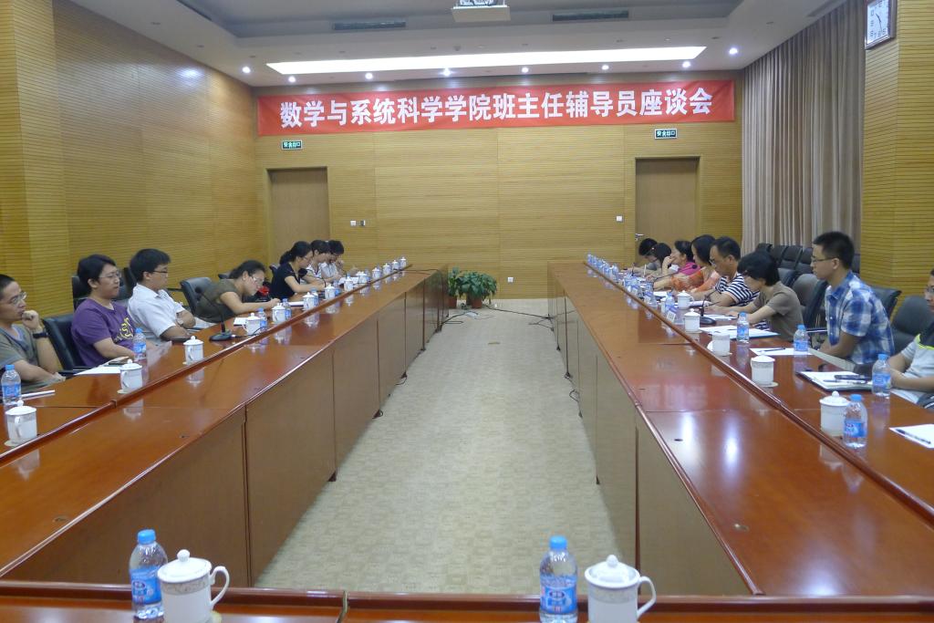 2012年8月31日上午,数学与系统科学太阳成集团tyc234cc官网班主任辅导员座谈会在新主楼第八会议室举行。出席会议的太阳成集团tyc234cc官网领导有院长郑志勇、党委书记李红捷、副院长李翠萍、副书记王菲,教务处副处长王敏作为特邀嘉宾出席了座谈会,此外,全院本科各年级班主任、辅导员20余人参加了会议。