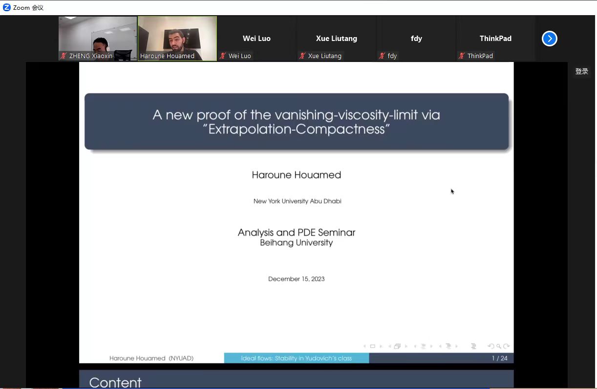 12月15日,应用数学系邀请了纽约大学阿布扎比分校Haroune Houamed教授,分享了题为“ A new proof of the vanishing-viscosity-limit in the Navier-Stokes equations via Extrapolation-Compactness”的线上学术报告。此次报告由郑孝信老师主持,应用数学系老师及相关研究领域的师生参加了本次学术活动。