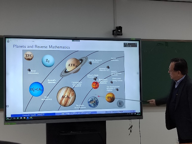 Tanaka教授在报告中向大家介绍了反推数学 (Reverse mathematics) 这一领域:寻找尽可能弱的集合存在公理来保证特定数学定理的成立。其中系统WKL0起到了关键的作用。Tanaka教授向大家介绍了系统WKL0的诸多有趣的性质和应用。此外Tanaka教授还介绍了关于Fσ集的布尔组合的决定性的一些新结果。报告结束后,参会者与Tanaka教授进行了热烈的讨论。