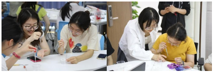 在李大冬老师的指导下,师生们热情高涨地投入到点蓝的实际操作中。大家用小铲或吸管,将珐琅釉料依次填入焊好的铜丝纹饰框架中,体验这门古老技艺的精妙之处。尽管制作过程繁琐,但师生们表现出了极大的耐心和创意,最终完成了一件件独具匠心的景泰蓝作品。