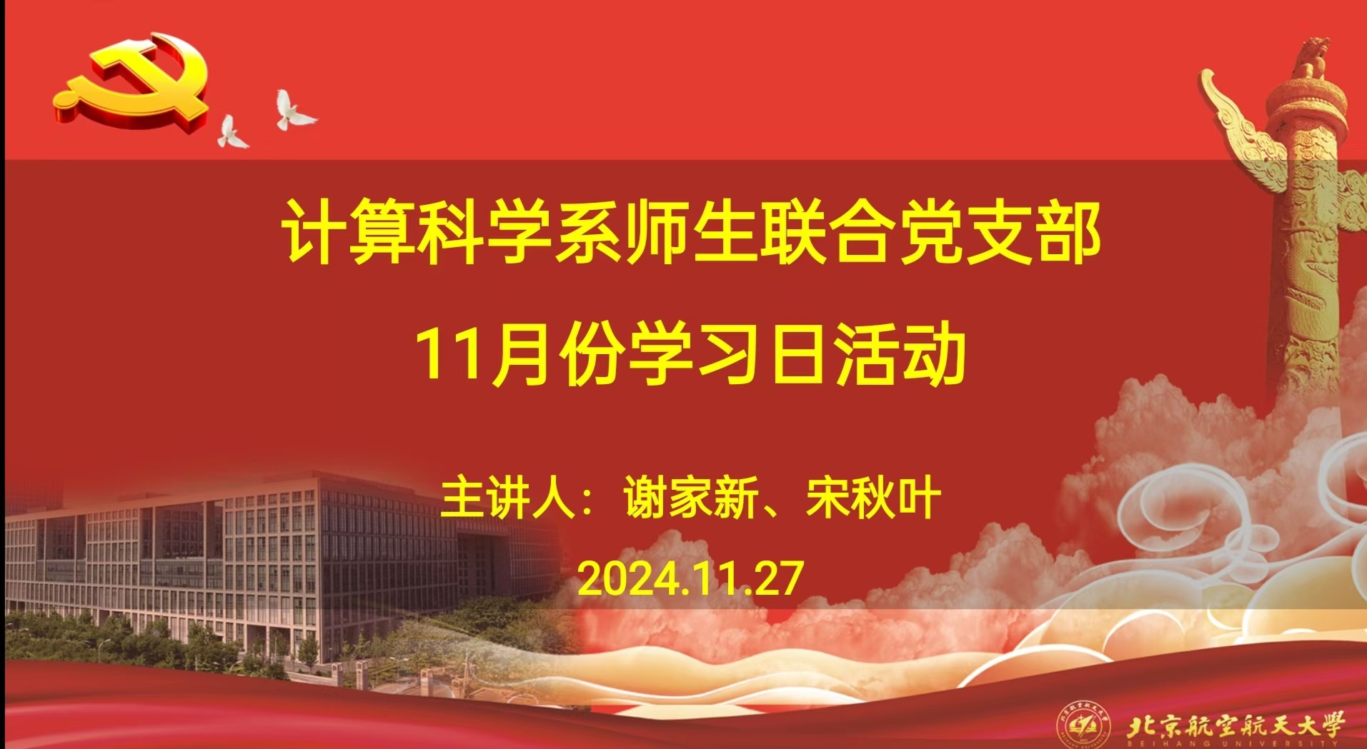2024年11月27日,计算科学系师生联合党支部在沙河主楼E303开展了11月的学习日活动。此次活动由谢家新同志和宋秋叶同志共同主持,支部全体党员参加。